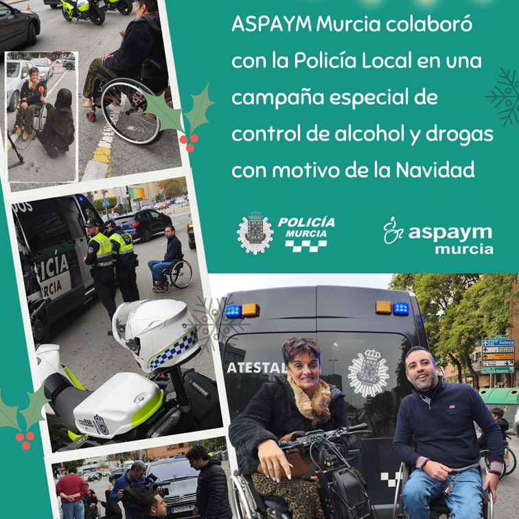 La Asociación de Personas con Lesión Medular y Otras Discapacidades Físicas de Murcia (ASPAYM Murcia) colaboró por segundo año consecutivo con la Policía Local del Ayuntamiento de Murcia en la Campaña Especial de Control de Alcohol, Drogas y Velocidad con motivo de la Navidad, desarrollada en distintas vías de circulación del municipio.