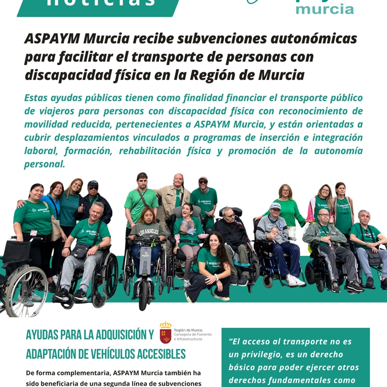 ASPAYM Murcia ha recibido durante 2025 subvenciones concedidas por la Consejería de Fomento e Infraestructuras de la Región de Murcia, a través de la Dirección General de Movilidad y Transportes, destinadas a mejorar la movilidad y la autonomía personal de las personas con discapacidad física.