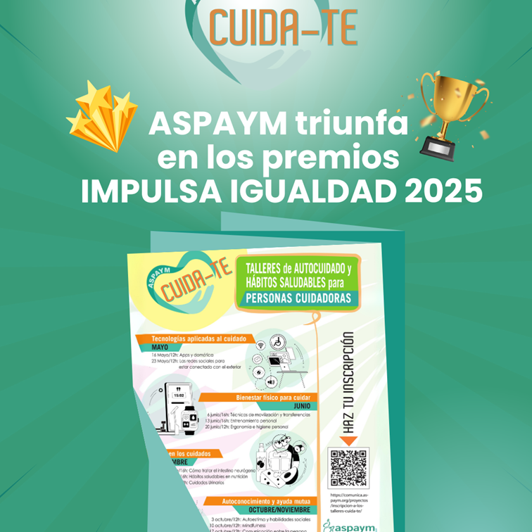 Federación Nacional ASPAYM ha triunfado en la categoría Autonomía Personal con su iniciativa Cuida-Te. El programa, posible gracias al Ministerio de Derechos Sociales, Consumo y Agenda 2030, reúne a cerca de un centenar de personas en cada convocatoria online. En sus sesiones, se abordan temas de interés para el bienestar físico y emocional de las personas cuidadoras, tanto formales como informales, de aquel sector de la sociedad al que representamos.