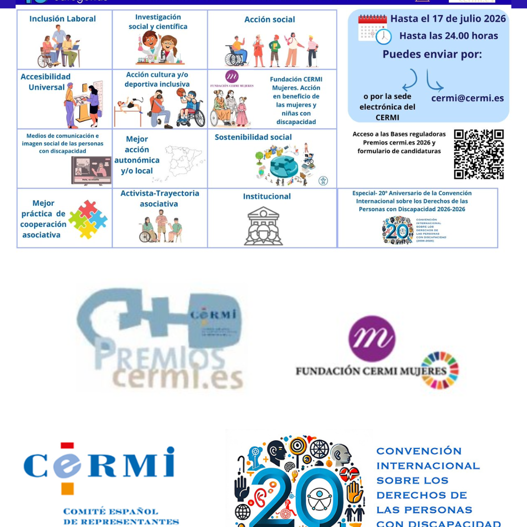 Se convoca la edición 2026 de los premios CERMI. La plataforma busca así reconocer un año más las mejores acciones de la sociedad en favor de las personas con discapacidad. El plazo de presentación de candidaturas está abierto hasta el 17 de julio.