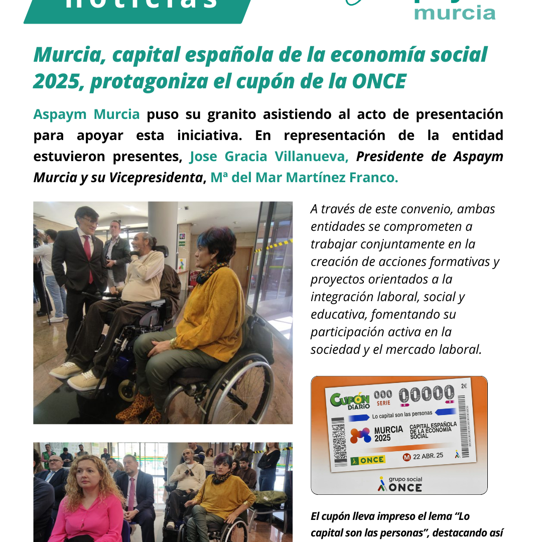 La ONCE dedica su Cupón Diario del martes 22 de abril a Murcia, Capital Española de la Economía Social 2025. Con esta iniciativa, cinco millones de cupones difundirán por toda España este reconocimiento, que pone en valor la importancia de la Economía Social en la región.